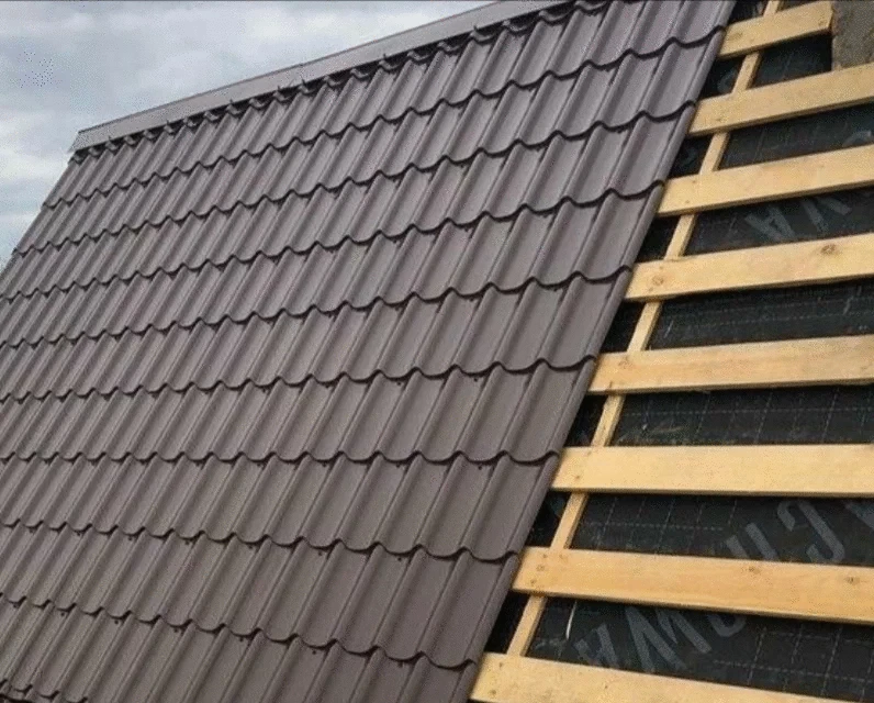 Металлический гофролист — верхний слой. Он нуждается в прочном каркасе и защите от влаги.