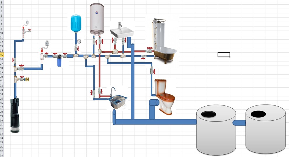 В самом общем виде система водоснабжения состоит из двух частей: источника подачи воды с контуром труб, а также канализации для стоков.